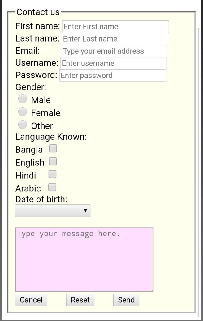Date of birth:<br> <input type=”date” value=”DOB”> <br><br>
